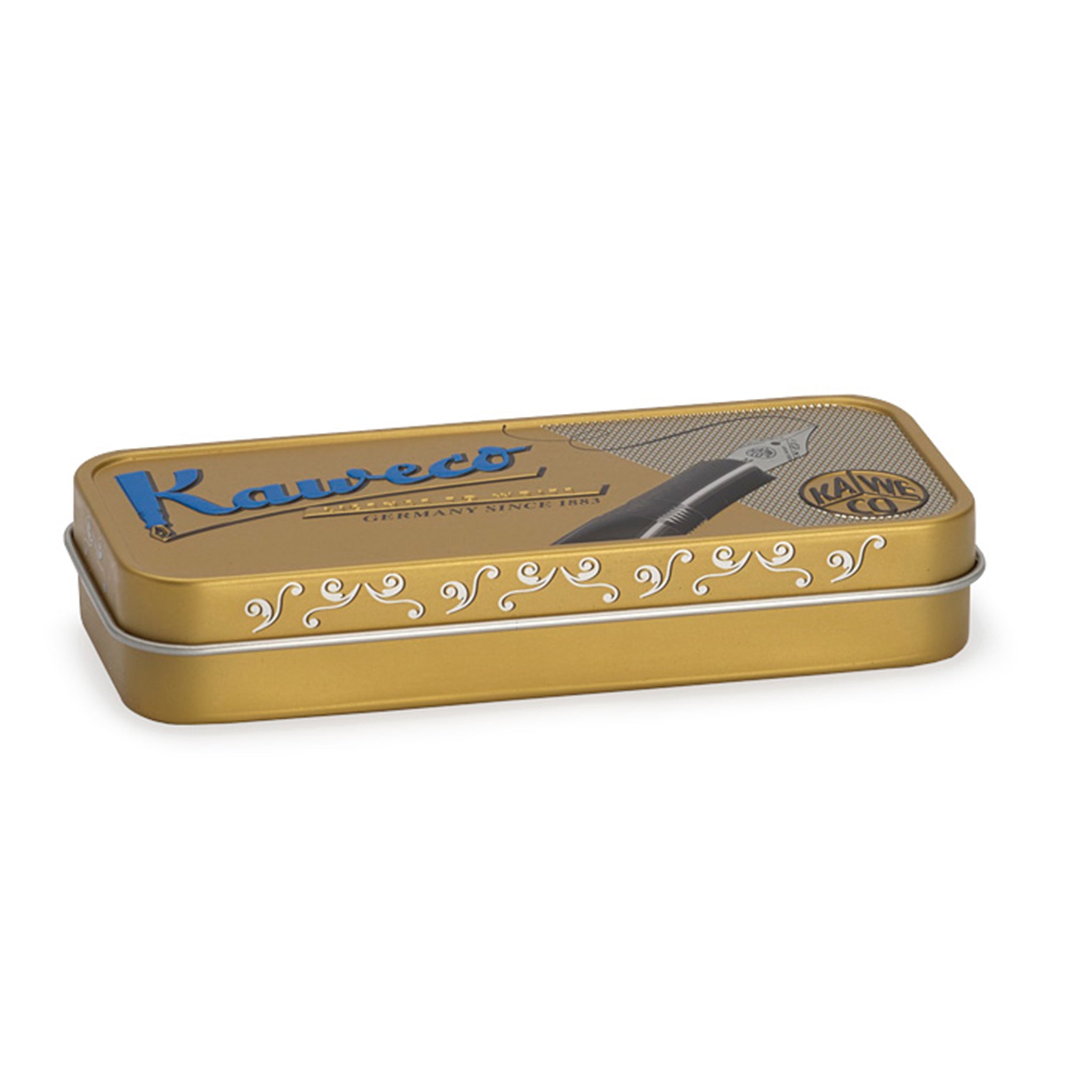 Der Stift wird in einer eleganten Blechdose geliefert und ist standardmäßig mit einer königsblauen Tintenpatrone bestückt.